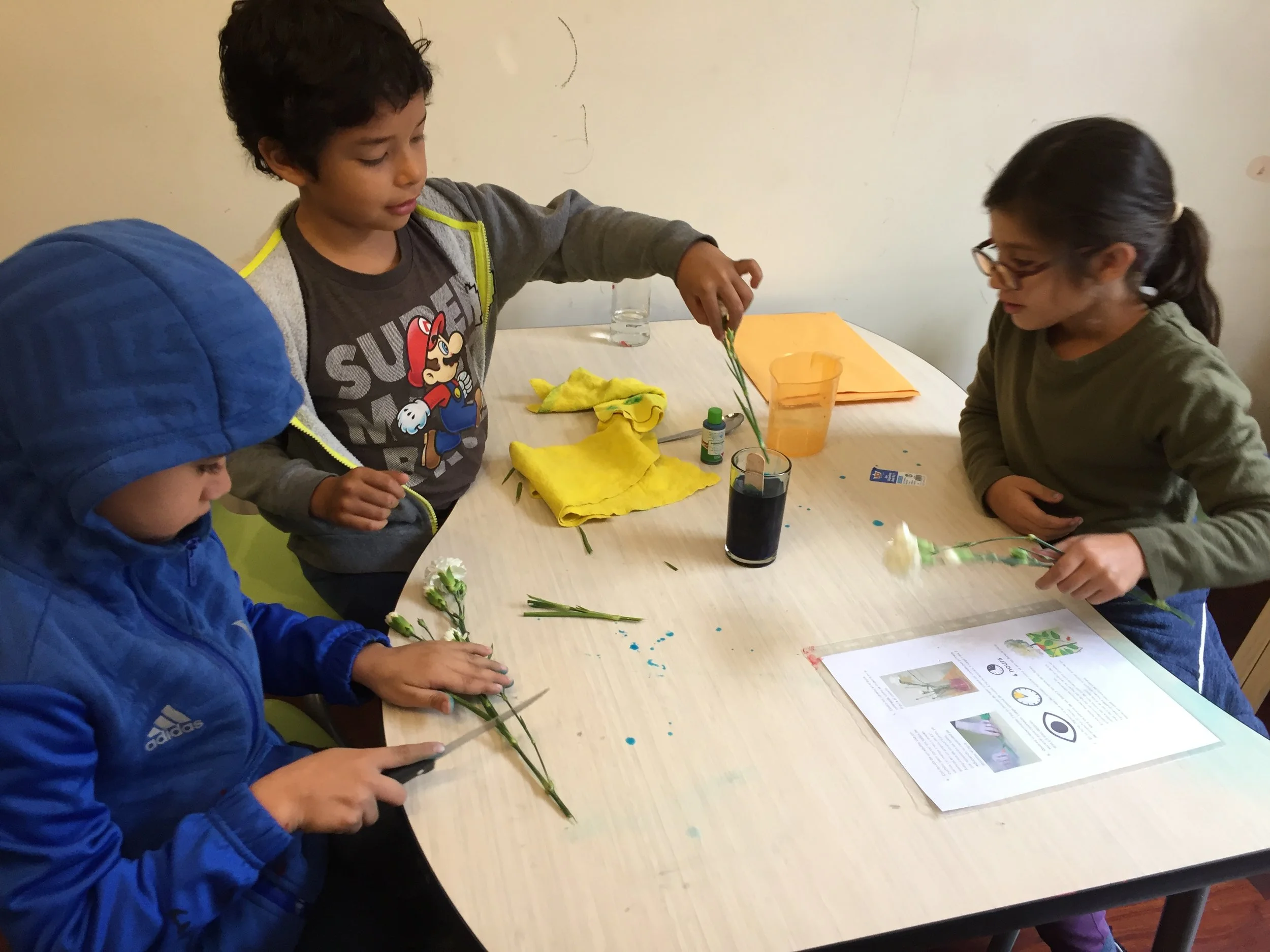 El jueves empezamos el día con atelier lo cual nos humedeció todo ya que tanto la lluvia como la pintura terminó por todos lados. Luego nos tocó miniquest y el experimento de esta vez fue “Acción de capilaridad”. Los Spark después de cortar sus claveles blancos en sus respectivos grupos metieron en sus floreros colorante de comida para ver qué pasaba con los pétalos de sus flores. Mañana tomarán nota de sus observaciones. Además en la tarde trabajaron arduamente en matemáticas. Las manos estuvieron manchadas pero muy ocupadas ese día.