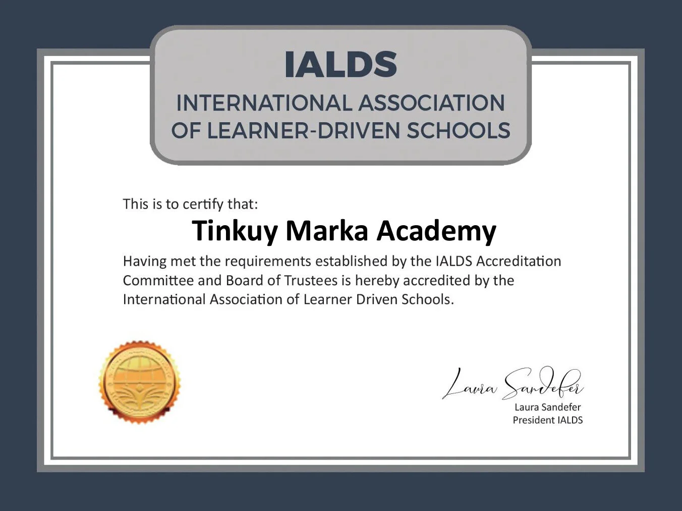 As an accredited member of the International Association of Learner-Driven Schools (IALDS), Tinkuy provides official transcripts and certificates by grade and school year, in either U.S. or Peruvian format. This service is free and primarily supports students transitioning to another school.2. U.S. High School Diploma and International University Access (Optional, great perks!):