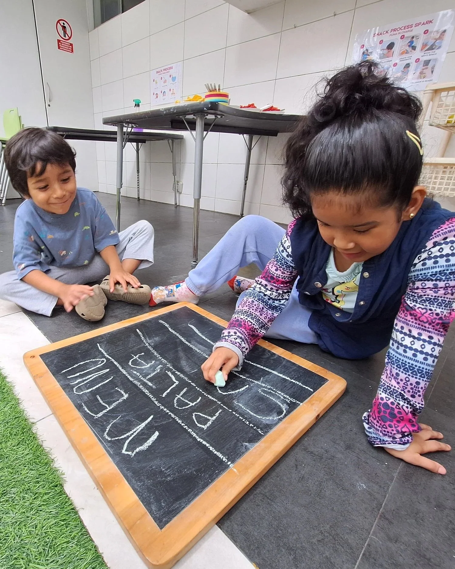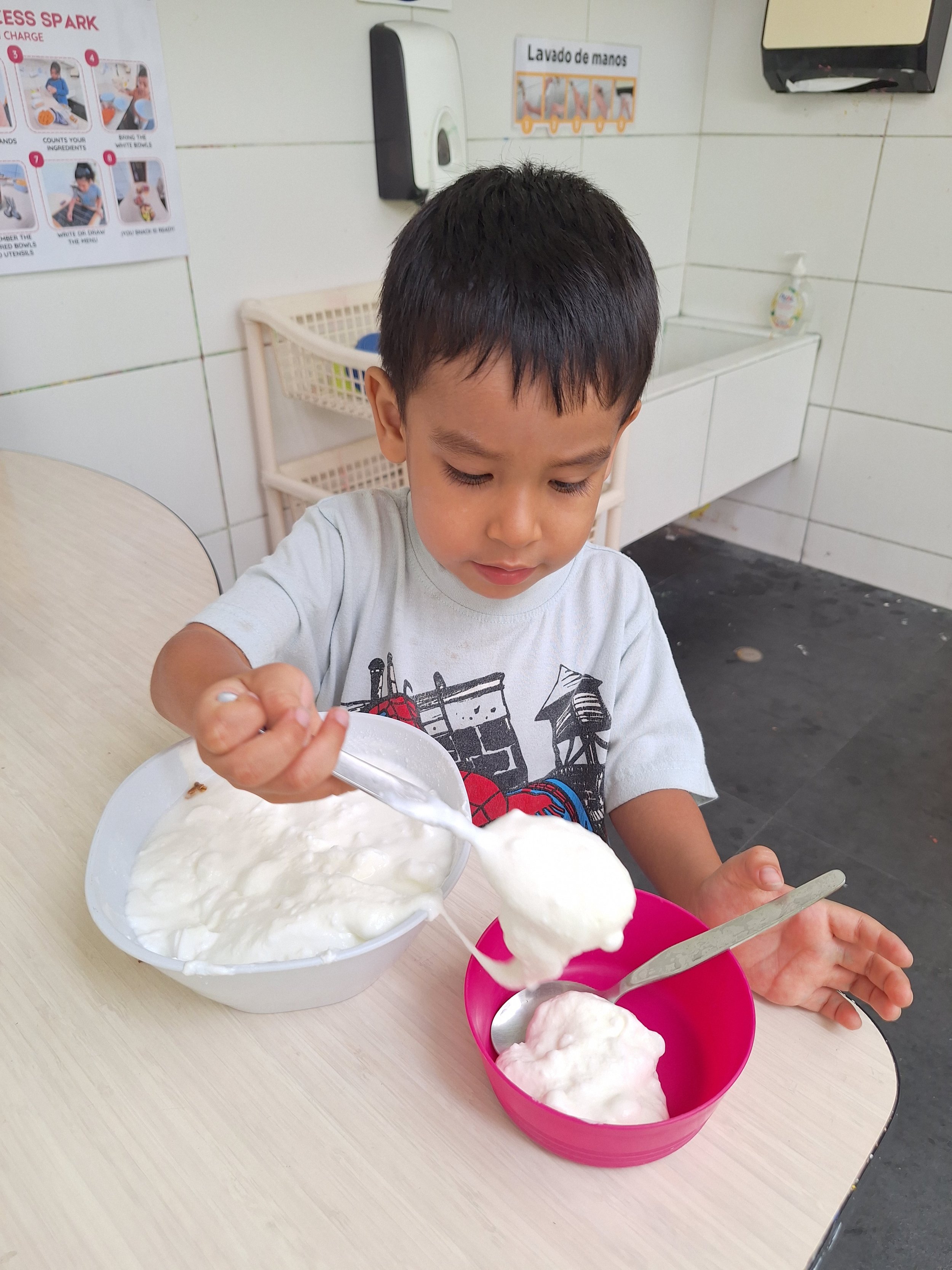 They pause their focused work and approach the table. They look at the poster displaying the sequence of steps and follow it attentively: first, clean the tables; then wash their hands; count the ingredients; set out the white bowls; place the ingredients; prepare the colored bowls and spoons; write the menu on the board; and finally, make sure everything is ready. Each action is carried out with intention, order, and care.