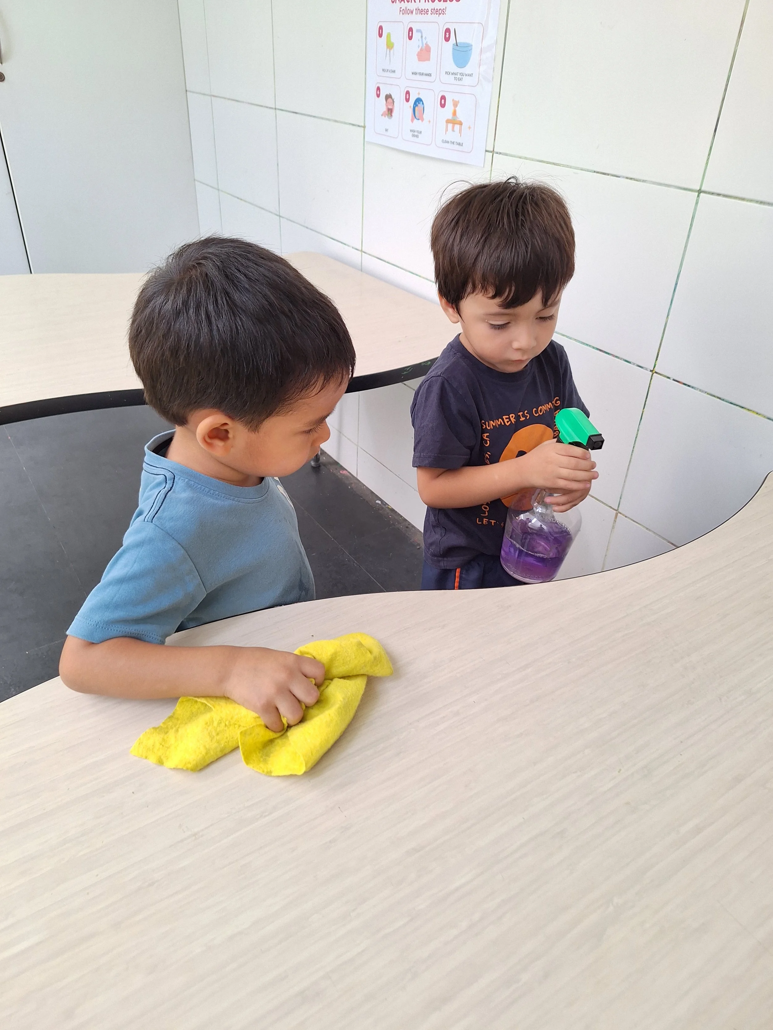 From Maria Montessori’s perspective, snack time is not a rigid or necessarily collective moment, but rather an opportunity to foster autonomy, self-awareness and self-regulation within a prepared environment. And so, each child practices every day the tough skill of listening to their own body, and understanding the signals of hunger. They can choose to eat when they feel hungry, respecting their own biological rhythms instead of following external schedules. Or they can choose to join friends and enjoy a good conversation while snacking together. At Spark Studio, we give them a wide window of time for them to decide when to eat, typically from 9:45 a.m. to 11:30 a.m. When there are left overs, we invite them to finish them later in the day if they get hungry again.
