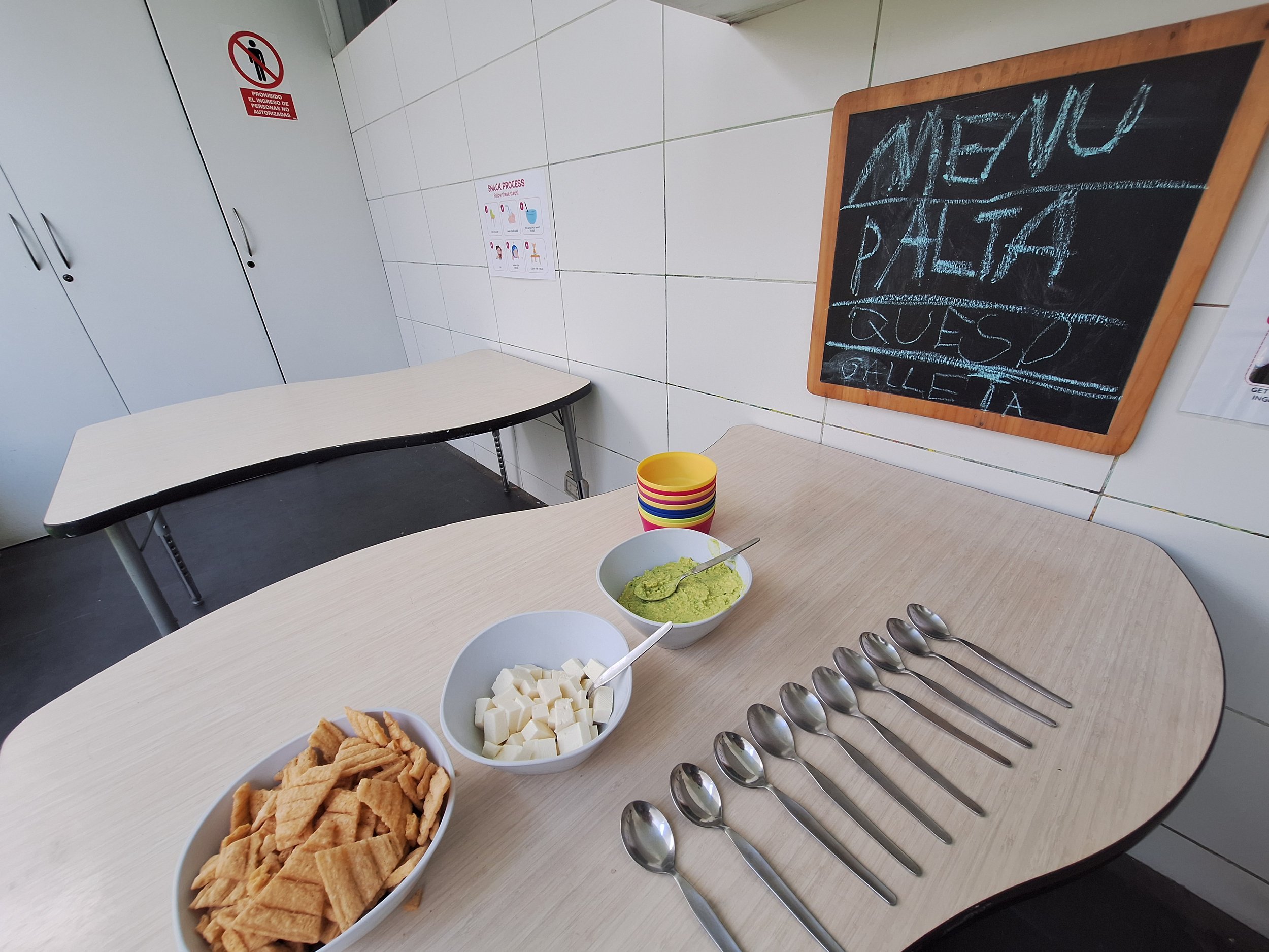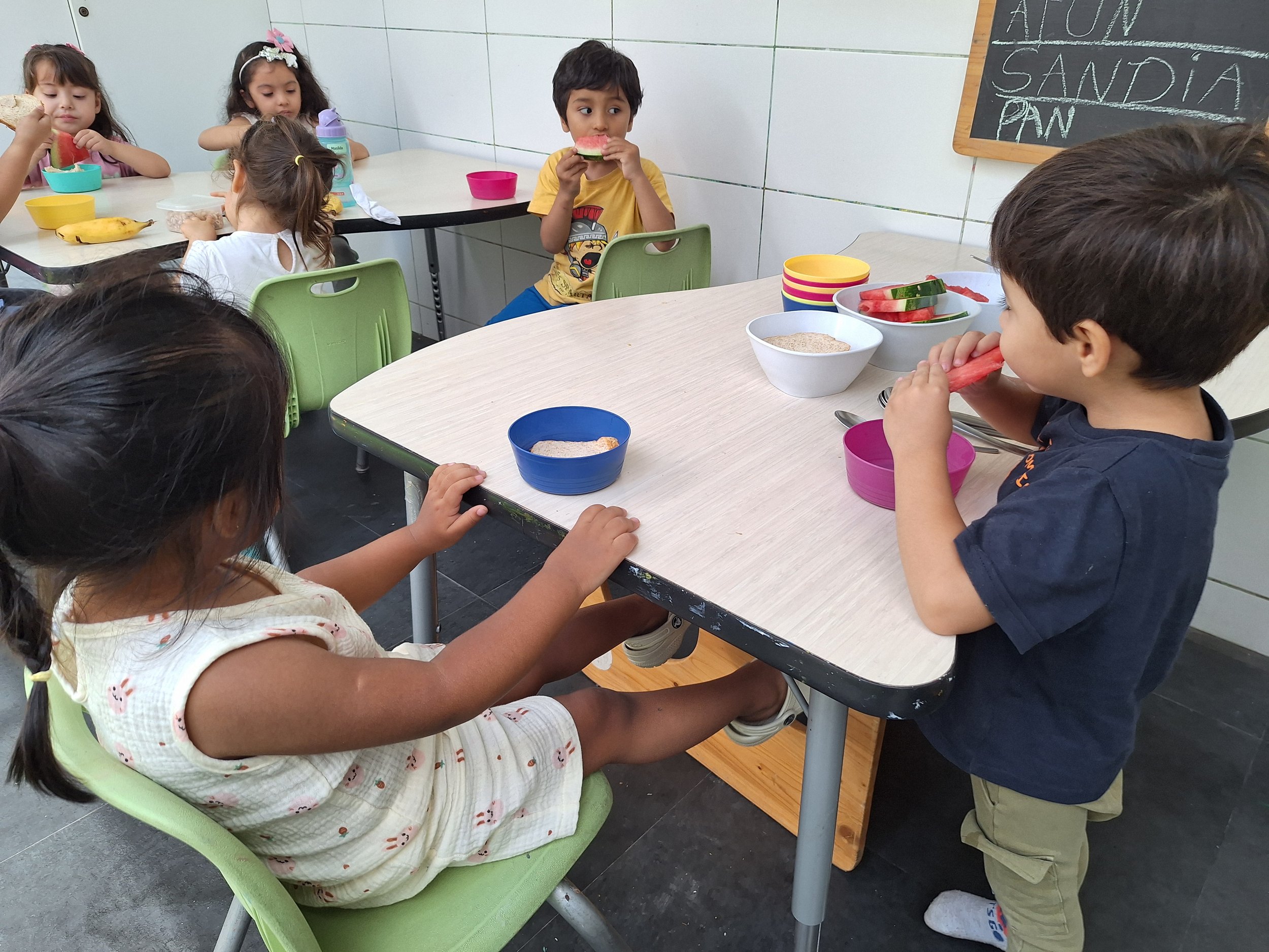The Puma in charge arrives at Tinkuy early with the snack and places it on the dining table. Then they participate in lunch, engage in quiet play activities, and glance at the clock from time to time. At 9:30 a.m., they recognize it is time to begin preparation.